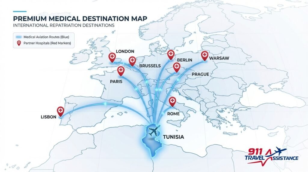 911 Travel Assistance organise et coordonne les rapatriements sanitaires internationaux depuis la Tunisie vers tous les pays d’origine des patients.